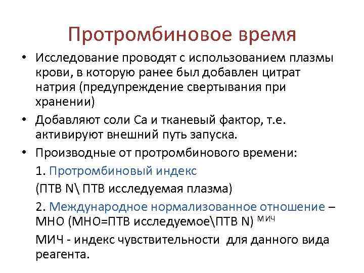 Протромбиновое время • Исследование проводят с использованием плазмы крови, в которую ранее был добавлен цитрат натрия (предупреждение свертывания при хранении) • Добавляют соли Са и тканевый фактор, т. е. активируют внешний путь запуска. • Производные от протромбинового времени: 1. Протромбиновый индекс (ПТВ N ПТВ исследуемая плазма) 2. Международное нормализованное отношение – МНО (МНО=ПТВ исследуемоеПТВ N) МИЧ - индекс чувствительности для данного вида реагента.