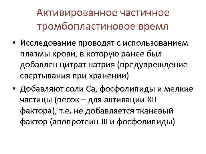 Активированное частичное тромбопластиновое время • Исследование проводят с использованием плазмы крови, в которую ранее был добавлен цитрат натрия (предупреждение свертывания при хранении) • Добавляют соли Са, фосфолипиды и мелкие частицы (песок – для активации XII фактора), т. е. не добавляется тканевый фактор (апопротеин III и фосфолипиды)