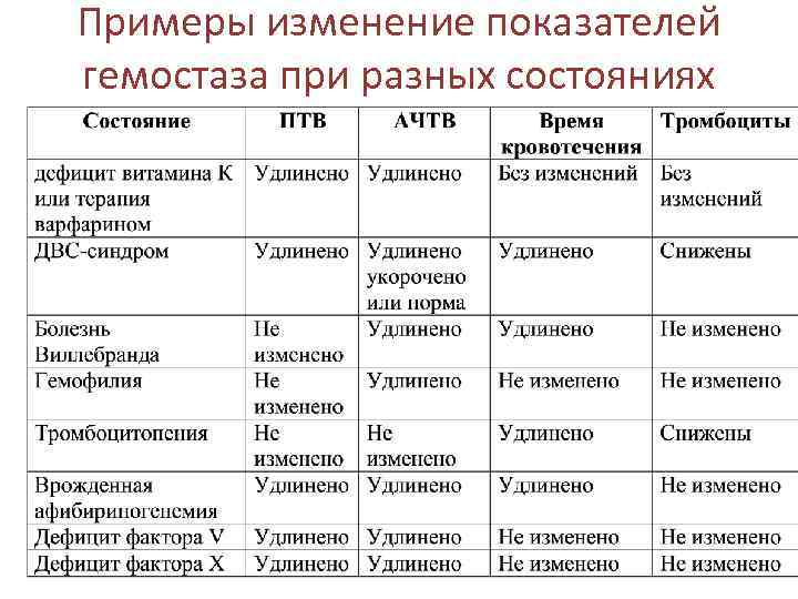 Примеры изменение показателей гемостаза при разных состояниях