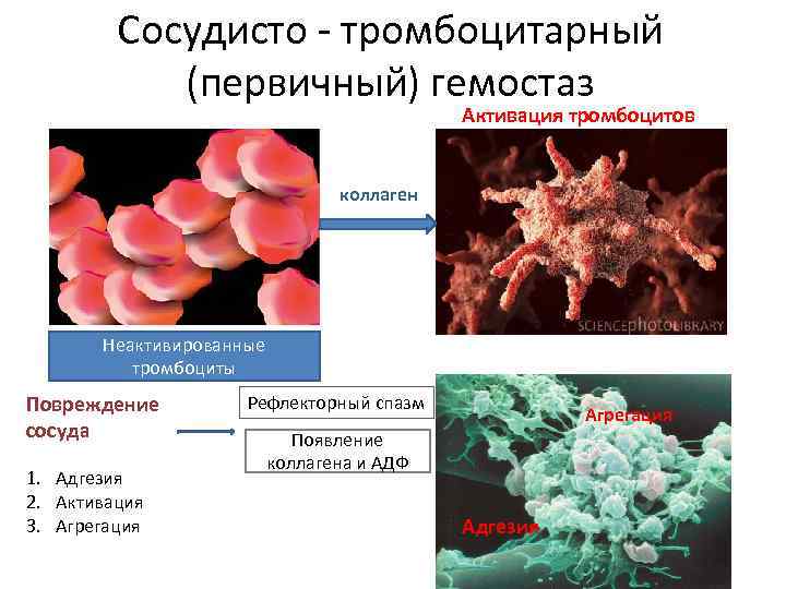 Сосудисто - тромбоцитарный (первичный) гемостаз Активация тромбоцитов коллаген Неактивированные тромбоциты Повреждение сосуда 1. Адгезия 2. Активация 3. Агрегация Рефлекторный спазм Агрегация Появление коллагена и АДФ Адгезия