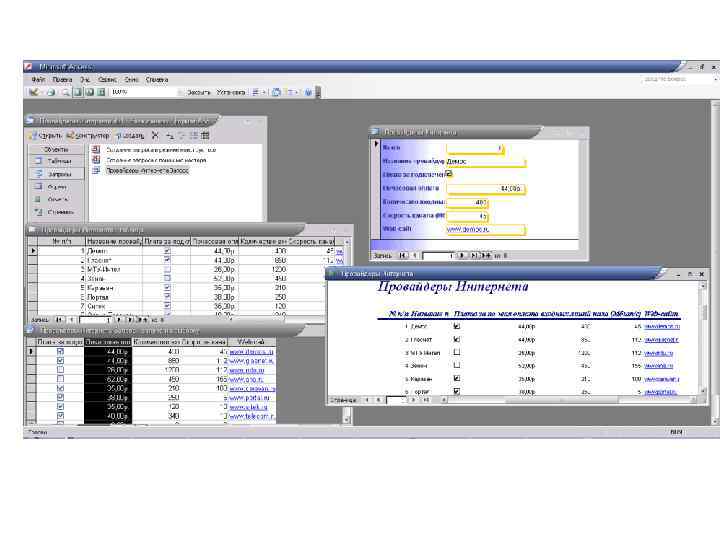 Формы позволяют отображать данные, содержащиеся в таблицах или запросах, в более удобном для восприятия виде. При помощи форм можно добавлять в таблицы новые данные, а также редактировать или удалять существующие. Форма может содержать рисунки, графики и другие внедренные объекты. В данном случае открыто окно формы Провайдеры Интернета.
