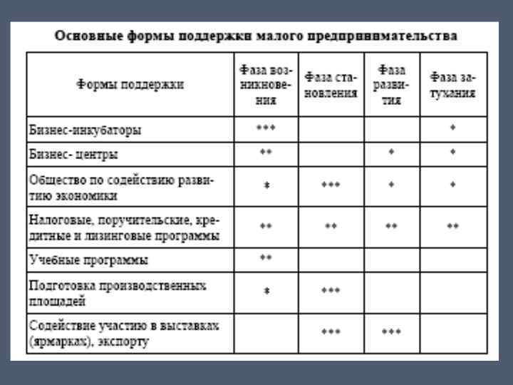 Типовая программа поддержки малого и среднего бизнеса исходит из следующих основных направлений и принципов: ♦ формирование нормативно-правовой основы, включая льготное налогообложение , упрощение процедуры регистрации и лицензирования; ♦ привлечение субъектов малого предпринимательства на конкурсной основе к участию в городских программах местного развития и реализации муниципальных заказов; ♦ предоставление на конкурсной основе помещений для размещения производства товаров и оказания услуг с предоставлением льгот по арендной плате; ♦ обеспечение информационных, консалтинговых услуг, обеспечение начального профессионального образовательного уровня для начинающих предпринимателей (менеджмент, бизнеспланирование и т. п. ); ♦ оказание финансовой помощи начинающим предпринимателям, производителям товаров, работ, услуг за счет создаваемого в рамках Программы фонда поддержки малого предпринимательства; ♦ организация семинаров, встреч, конференций по проблемам малого бизнеса, выставок-ярмарок продукции субъектов малого предпринимательства и т. п.