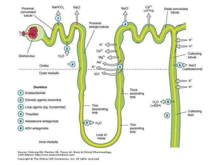 Давайте еще раз прогуляемся по канальцам нефрона…. Гломерула фильтрация (170 л/сутки) Дистальный каналец и начальный сегмент собирательной трубочки Реабсорбция: ØNa+ (регулирутся альдостероном), ØН 2 О (регулируется вазопрессином) ØНСО 3 -, Cl-, Ca 2+, Mg 2+ Секреция Н+и К+ Проксимальный каналец Реабсорбция: Толстый сегмент восходящего колена петли Генле ØNa+, K+, HCO 3 -, Cl-: 65% ØH 2 O: 65% ØГлюкоза, аминокислоты, следовые кол-ва белка: 100% Ø Ca 2+, Mg 2+ Секреция органических кислот, оснований и Н+ Реабсорбция: Собирательная трубочка: Реабсорбция Н 2 О (регулируется вазопрессином) Нисходящее колено петли Генле: Na+ Cl- Реабсорбция ØH 2 O: 10% Тонкий сегмент восходящего колена петли Генле Реабсорбция Na+ (пассивная) Диурез (1. 5 -2 л/сутки) Na+ Cl- Мочевина Осмотический градиент (по отношению к плазме крови) ØNa+, K+, Cl-: до 25% ØHCO 3 -, Ca 2+, Mg 2+ Секреция Н+