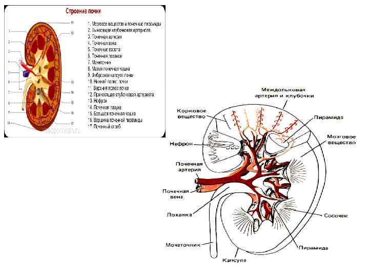Нирки • функції: • регуляція об'єму крові і позаклітинної рідини • регуляція осмотичного тиску крові (осморегуляція). • регуляція іонного складу плазми крові та іонного балансу організму (іонна регуляція). • регуляція кислотно-основного стану (р. Н крові) • регуляція артеріального тиску, еритропоезу, згортання крові • участь в обміні білків, ліпідів і вуглеводів (метаболічна функція). • виділення з організму кінцевих продуктів азотистого обміну і чужорідних речовин, надлишку органічних речовин (глюкоза, амінокислоти та ін. )