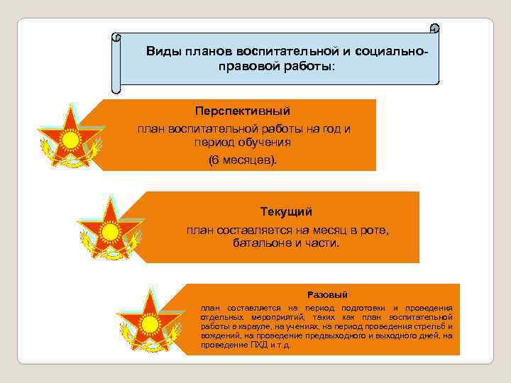 Виды планов воспитательной и социальноправовой работы: Перспективный план воспитательной работы на год и период обучения (6 месяцев). Текущий план составляется на месяц в роте, батальоне и части. Разовый план составляется на период подготовки и проведения отдельных мероприятий, таких как план воспитательной работы в карауле, на учениях, на период проведения стрельб и вождений, на проведение предвыходного и выходного дней, на проведение ПХД и т. д.