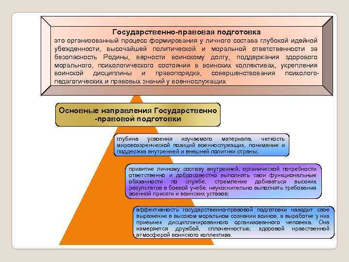 Государственно-правовая подготовка это организованный процесс формирования у личного состава глубокой идейной убежденности, высочайшей политической и моральной ответственности за безопасность Родины, верности воинскому долгу, поддержания здорового морального, психологического состояния в воинских коллективах, укрепления воинской дисциплины и правопорядка, совершенствования психологопедагогических и правовых знаний у военнослужащих Основные направления Государственно -правовой подготовки глубина усвоения изучаемого материала, четкость мировоззренческой позиций военнослужащих, понимание и поддержка внутренней и внешней политики страны; привитие личному составу внутренней, органической потребности ответственно и добросовестно выполнять свои функциональные обязанности по службе, стремление добиваться высоких результатов в боевой учебе, неукоснительно выполнять требования военной присяги и воинских уставов; эффективность государственно-правовой подготовки находит свое выражение в высоком моральном сознании воинов, в выработке у них привычек дисциплинированного организованного человека. Она измеряется дружбой, сплоченностью, здоровой нравственной атмосферой воинского коллектива.