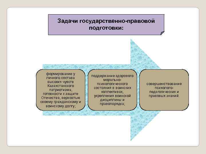 Задачи государственно-правовой подготовки: формирование у личного состава высоких чувств Казахстанского патриотизма, готовности к защите Отечества, верностью своему гражданскому и воинскому долгу; поддержание здорового моральнопсихологического состояния в воинских коллективах, укрепления воинской дисциплины и правопорядка; совершенствование психологопедагогических и правовых знаний.