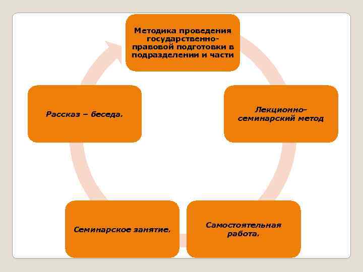 Методика проведения государственноправовой подготовки в подразделении и части Рассказ – беседа. Семинарское занятие. Лекционносеминарский метод Самостоятельная работа.