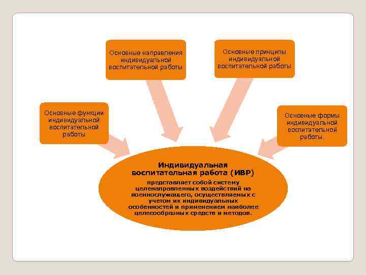 Основные направления индивидуальной воспитательной работы Основные принципы индивидуальной воспитательной работы Основные функции индивидуальной воспитательной работы Основные формы индивидуальной воспитательной работы. Индивидуальная воспитательная работа (ИВР) представляет собой систему целенаправленных воздействий на военнослужащего, осуществляемых с учетом их индивидуальных особенностей и применением наиболее целесообразных средств и методов.