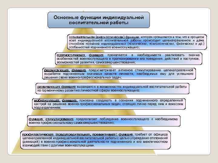 Основные функции индивидуальной воспитательной работы познавательная (диагностическая) функция, которая проявляется в том, что в процессе всей индивидуальной воспитательной работы происходит целенаправленное и даже стихийное познание индивидуальных (психических, психологических, физических и др. ) особенностей подчиненного военнослужащего; прогностическая функция проявляется в необходимости реализовать знание особенностей военнослужащего в прогнозировании его поведения, действий и поступков, возможностей развития, самосовершенствования; формирующая функция предусматривает активное стимулирование целенаправленной выработки подчиненным значимых качеств личности, необходимых ему для успешного решения своих военно-профессиональных задач; развивающая функция выражается в возможностях индивидуальной воспитательной работы по гармоничному развитию личностной сферы военнослужащего; мобилизующая функция призвана создавать в сознании подчиненного определенный настрой на решение военно-профессиональных задач, стоящих лично перед ним и воинским подразделением; функция стимулирования предполагает побуждение военнослужащего к необходимому военно-профессиональному самосовершенствованию; профилактическая (предупредительная, превентивная) функция требует от офицера целенаправленной индивидуальной воспитательной работы с целью упреждения отклонений (девиаций) в военно-профессиональной деятельности подчиненного и его межличностном взаимодействии с другими военнослужащими.