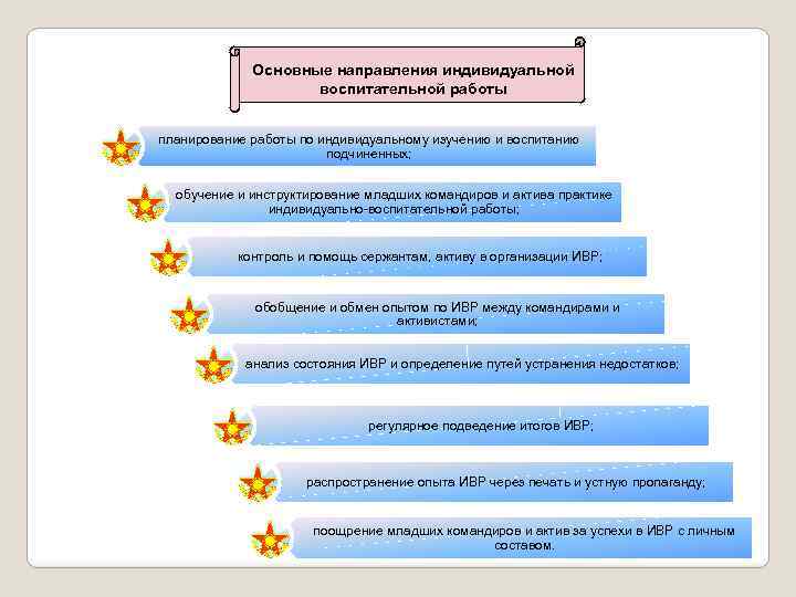 Основные направления индивидуальной воспитательной работы планирование работы по индивидуальному изучению и воспитанию подчиненных; обучение и инструктирование младших командиров и актива практике индивидуально-воспитательной работы; контроль и помощь сержантам, активу в организации ИВР; обобщение и обмен опытом по ИВР между командирами и активистами; анализ состояния ИВР и определение путей устранения недостатков; регулярное подведение итогов ИВР; распространение опыта ИВР через печать и устную пропаганду; поощрение младших командиров и актив за успехи в ИВР с личным составом.