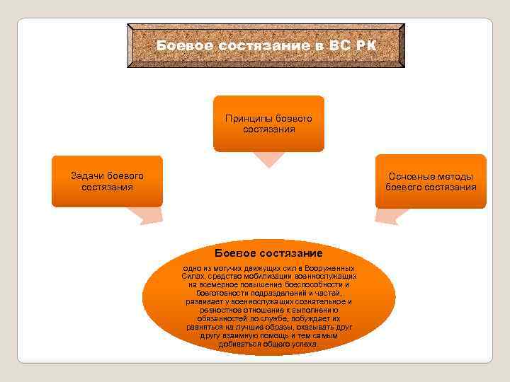Боевое состязание в ВС РК Принципы боевого состязания Задачи боевого состязания Основные методы боевого состязания Боевое состязание одно из могучих движущих сил в Вооруженных Силах, средство мобилизации военнослужащих на всемерное повышение боеспособности и боеготовности подразделений и частей, развивает у военнослужащих сознательное и ревностное отношение к выполнению обязанностей по службе, побуждает их равняться на лучшие образы, оказывать другу взаимную помощь и тем самым добиваться общего успеха.