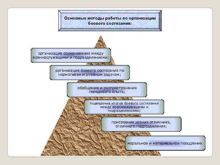 Основные методы работы по организации боевого состязания: организация соревнования между военнослужащими и подразделениями; организация боевого состязания по нормативам и учебным задачам; обобщение и распространение передового опыта; подведение итогов боевого состязания между военнослужащими и подразделениями; присвоение звания отличника, отличного подразделения; моральное и материальное поощрение.