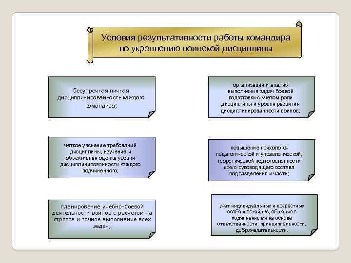 Условия результативности работы командира по укреплению воинской дисциплины безупречная личная дисциплинированность каждого командира; четкое уяснение требований дисциплины, изучение и объективная оценка уровня дисциплинированности каждого подчиненного; планирование учебно-боевой деятельности воинов с расчетом на строгое и точное выполнение всех задач; организация и анализ выполнения задач боевой подготовки с учетом роли дисциплины и уровня развития дисциплинированности воинов; повышение психологопедагогической и управленческой, теоретической подготовленности всего руководящего состава подразделения и части; учет индивидуальных и возрастных особенностей л/с, общение с подчиненными на основе ответственности, принципиальности, доброжелательности.