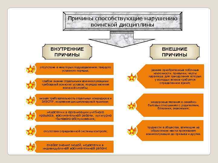 Причины способствующие нарушению воинской дисциплины ВНУТРЕННИЕ ПРИЧИНЫ отсутствие в некоторых подразделениях твердого уставного порядка; слабое знание отдельными военнослужащими требований воинских уставов, порядка несения воинской службы; низкая требовательность отдельных командиров и ЗКВСПР, искажение дисциплинарной практики; ВНЕШНИЕ ПРИЧИНЫ раннее приобретенные побочные наклонности, привычки, черты характера, для преодоления которых у молодых воинов требуется определенное время; нездоровые явления в семейнобытовых отношениях с родителями, близкими, знакомыми; недостатки в организации учебного процесса, воспитательной работы, культурно -бытового обслуживания; отсутствие определенной системы контроля; слабое знание людей, недостатки в индивидуальной воспитательной работе. трудности в обществе, влияющие на образ жизни места проживания военнослужащих до призыва и другие.