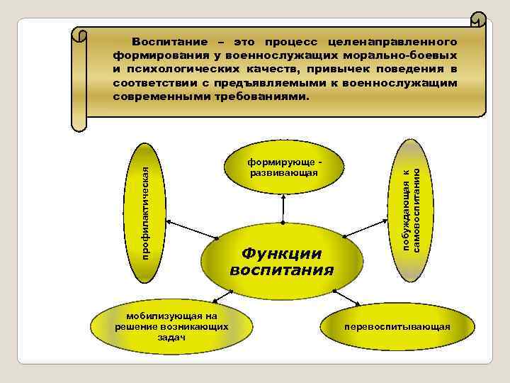 мобилизующая на решение возникающих задач формирующе развивающая Функции воспитания побуждающая к самовоспитанию профилактическая Воспитание – это процесс целенаправленного формирования у военнослужащих морально-боевых и психологических качеств, привычек поведения в соответствии с предъявляемыми к военнослужащим современными требованиями. перевоспитывающая