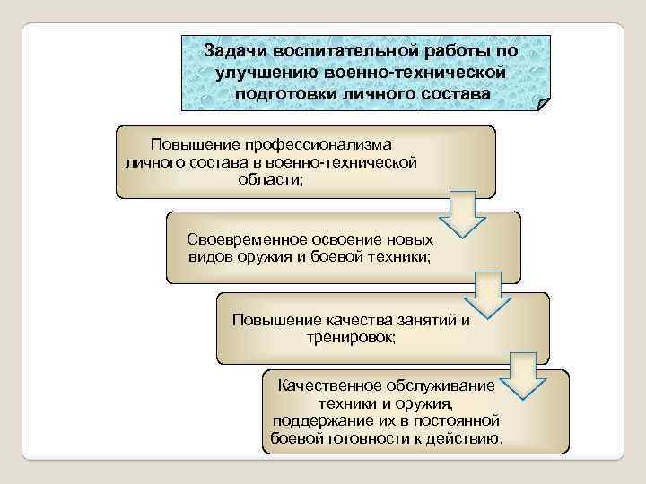 Задачи воспитательной работы по улучшению военно-технической подготовки личного состава Повышение профессионализма личного состава в военно-технической области; Своевременное освоение новых видов оружия и боевой техники; Повышение качества занятий и тренировок; Качественное обслуживание техники и оружия, поддержание их в постоянной боевой готовности к действию.