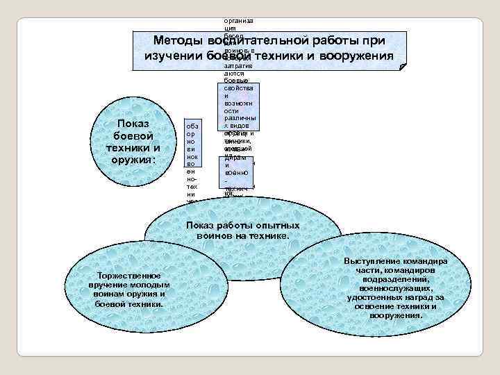 организа ция бесед для воинов, в которых затрагив аются боевые свойства и возможн ости различны х видов оружия и посещ техники, ение стоящей коман на дирам вооружен и ии части военно и вооружен технич ия; еских Методы воспитательной работы при изучении боевой техники и вооружения Показ боевой техники и оружия: Торжественное вручение молодым воинам оружия и боевой техники. обз ор но ви нок во ен нотех ни чес лектор кой иев; ли тер Показ работы опытных ату ры. воинов на технике. Выступление командира части, командиров подразделений, военнослужащих, удостоенных наград за освоение техники и вооружения.