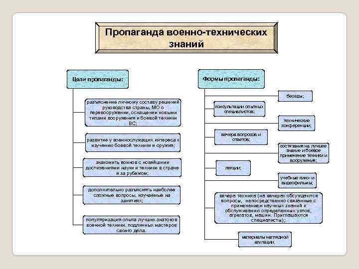 Пропаганда военно-технических знаний Цели пропаганды: Формы пропаганды: беседы; разъяснение личному составу решений руководства страны, МО о перевооружении, оснащении новыми типами вооружения и боевой техники ВС; развитие у военнослужащих интереса к изучению боевой техники и оружия; знакомить воинов с новейшими достижениями науки и техники в стране и за рубежом; дополнительно разъяснять наиболее сложные вопросы, изучаемые на занятиях; популяризация опыта лучших знатоков военной техники, подлинных мастеров своего дела. консультации опытных специалистов; технические конференции; вечера вопросов и ответов; состязания на лучшее знание и боевое применение техники и вооружения; лекции; учебные кино- и видеофильмы; вечера техника (на вечерах обсуждаются вопросы, непосредственно связанные с применением научных знаний к обслуживанию определенных узлов, агрегатов, машин. Приглашаются специалисты); материалы наглядной агитации.