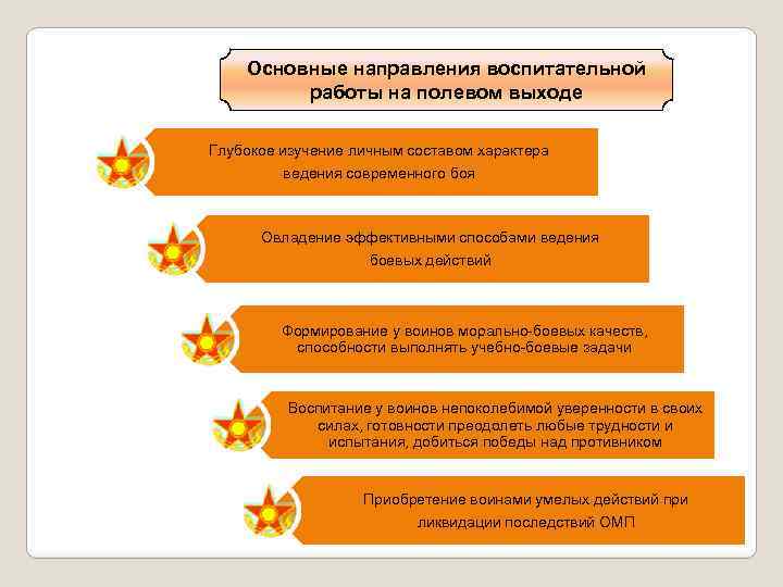 Основные направления воспитательной работы на полевом выходе Глубокое изучение личным составом характера ведения современного боя Овладение эффективными способами ведения боевых действий Формирование у воинов морально-боевых качеств, способности выполнять учебно-боевые задачи Воспитание у воинов непоколебимой уверенности в своих силах, готовности преодолеть любые трудности и испытания, добиться победы над противником Приобретение воинами умелых действий при ликвидации последствий ОМП