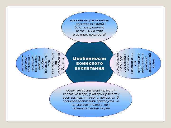 Особенности воинского воспитания осуществлен ие в ходе воспитания моральнопсихологичес кой подготовки к действиям в условиях современной войны воинском коллективе, имеющем особую организацию, свои взаимоотноше ния, своеобразный быт и т. д. воспитание протекает постоянно в военная направленность – подготовка людей к бою, преодолению связанных с этим огромных трудностей объектом воспитания являются взрослые люди, у которых уже есть свои взгляды на жизнь, привычки. В процессе воспитания приходится не только воспитывать, но и перевоспитывать людей