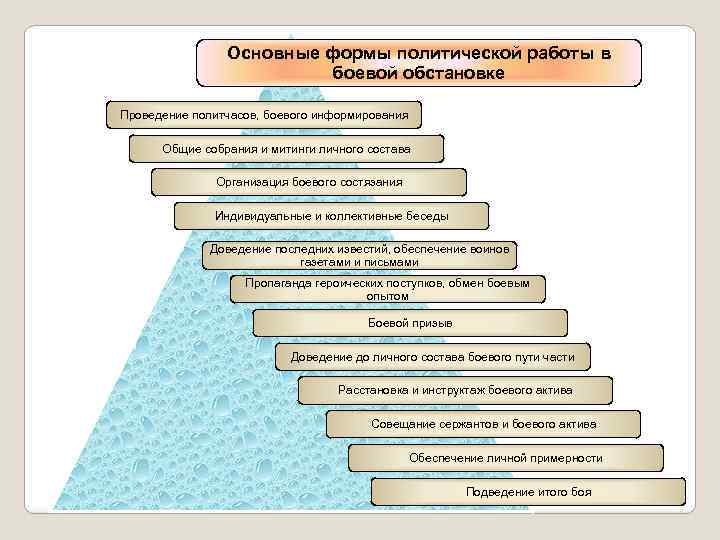 Основные формы политической работы в боевой обстановке Проведение политчасов, боевого информирования Общие собрания и митинги личного состава Организация боевого состязания Индивидуальные и коллективные беседы Доведение последних известий, обеспечение воинов газетами и письмами Пропаганда героических поступков, обмен боевым опытом Боевой призыв Доведение до личного состава боевого пути части Расстановка и инструктаж боевого актива Совещание сержантов и боевого актива Обеспечение личной примерности Подведение итого боя