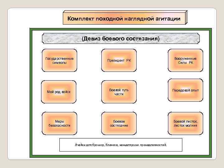 Комплект походной наглядной агитации (Девиз боевого состязания) Государственные символы Президент РК Мой род войск Боевой путь части Передовой опыт Меры безопасности Боевое состязание Боевой листок, листок молния Ячейки для брошюр, бланков, канцелярских принадлежностей. Вооруженные Силы РК