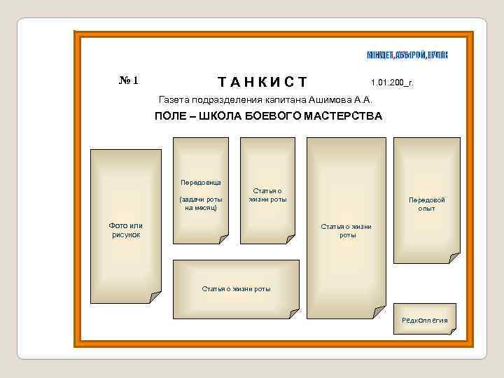 МІНДЕТ, АБЫРОЙ, ЕРЛІК № 1 ТАНКИСТ 1. 01. 200_г. Газета подразделения капитана Ашимова А. А. ПОЛЕ – ШКОЛА БОЕВОГО МАСТЕРСТВА Передовица (задачи роты на месяц) Статья о жизни роты Фото или рисунок Передовой опыт Статья о жизни роты Редколлегия