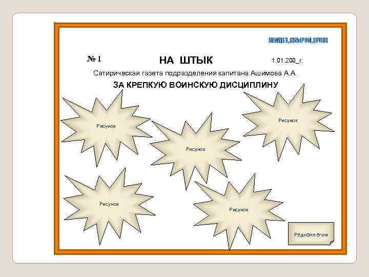 МІНДЕТ, АБЫРОЙ, ЕРЛІК № 1 НА ШТЫК 1. 01. 200_г. Сатирическая газета подразделения капитана Ашимова А. А. ЗА КРЕПКУЮ ВОИНСКУЮ ДИСЦИПЛИНУ Рисунок Рисунок Редколлегия