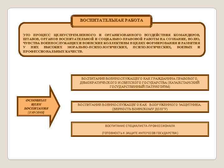 ВОСПИТАТЕЛЬНАЯ РАБОТА ЭТО ПРОЦЕСС ЦЕЛЕУСТРЕМЛЕННОГО И ОРГАНИЗОВАННОГО ВОЗДЕЙСТВИЯ КОМАНДИРОВ, ШТАБОВ, ОРГАНОВ ВОСПИТАТЕЛЬНОЙ И СОЦИАЛЬНО-ПРАВОВОЙ РАБОТЫ НА СОЗНАНИЕ, ВОЛЮ, ЧУВСТВА ВОЕННОСЛУЖАЩИХ И ВОИНСКИЕ КОЛЛЕКТИВЫ В ЦЕЛЯХ ФОРМИРОВАНИЯ И РАЗВИТИЯ У НИХ ВЫСОКИХ МОРАЛЬНО-ПСИХОЛОГИЧЕСКИХ, БОЕВЫХ И ПРОФЕССИОНАЛЬНЫХ КАЧЕСТВ. ВОСПИТАНИЕ ВОЕННОСЛУЖАЩЕГО КАК ГРАЖДАНИНА ПРАВОВОГО, ДЕМОКРАТИЧЕСКОГО И СВЕТСКОГО ГОСУДАРСТВА (КАЗАХСТАНСКИЙ ГОСУДАРСТВЕННЫЙ ПАТРИОТИЗМ) ОСНОВНЫЕ ЦЕЛИ ВОСПИТАНИЯ (3 УРОВНЯ) ВОСПИТАНИЕ ВОЕННОСЛУЖАЩЕГО КАК ВООРУЖЕННОГО ЗАЩИТНИКА. (ВЕРНОСТЬ ВОИНСКОМУ ДОЛГУ) ВОСПИТАНИЕ СПЕЦИАЛИСТА-ПРОФЕССИОНАЛА (ГОТОВНОСТЬ К ЗАЩИТЕ ИНТЕРЕСОВ ГОСУДАРСТВА)