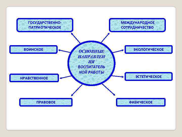 ГОСУДАРСТВЕННОПАТРИОТИЧЕСКОЕ ВОИНСКОЕ НРАВСТВЕННОЕ ПРАВОВОЕ МЕЖДУНАРОДНОЕ СОТРУДНИЧЕСТВО ОСНОВНЫЕ НАПРАВЛЕН ИЯ ВОСПИТАТЕЛЬ НОЙ РАБОТЫ ЭКОЛОГИЧЕСКОЕ ЭСТЕТИЧЕСКОЕ ФИЗИЧЕСКОЕ