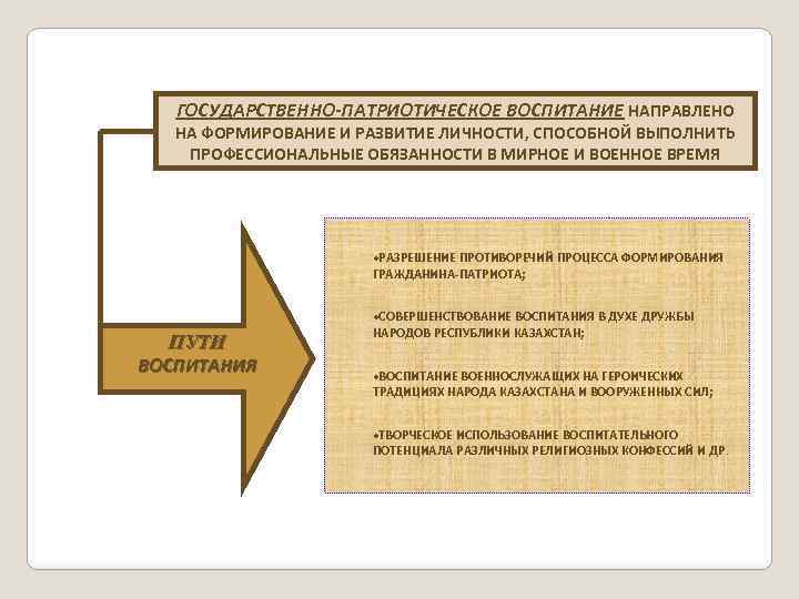 ГОСУДАРСТВЕННО-ПАТРИОТИЧЕСКОЕ ВОСПИТАНИЕ НАПРАВЛЕНО НА ФОРМИРОВАНИЕ И РАЗВИТИЕ ЛИЧНОСТИ, СПОСОБНОЙ ВЫПОЛНИТЬ ПРОФЕССИОНАЛЬНЫЕ ОБЯЗАННОСТИ В МИРНОЕ И ВОЕННОЕ ВРЕМЯ ·РАЗРЕШЕНИЕ ПРОТИВОРЕЧИЙ ПРОЦЕССА ФОРМИРОВАНИЯ ГРАЖДАНИНА-ПАТРИОТА; ПУТИ ВОСПИТАНИЯ ·СОВЕРШЕНСТВОВАНИЕ ВОСПИТАНИЯ В ДУХЕ ДРУЖБЫ НАРОДОВ РЕСПУБЛИКИ КАЗАХСТАН; ·ВОСПИТАНИЕ ВОЕННОСЛУЖАЩИХ НА ГЕРОИЧЕСКИХ ТРАДИЦИЯХ НАРОДА КАЗАХСТАНА И ВООРУЖЕННЫХ СИЛ; ·ТВОРЧЕСКОЕ ИСПОЛЬЗОВАНИЕ ВОСПИТАТЕЛЬНОГО ПОТЕНЦИАЛА РАЗЛИЧНЫХ РЕЛИГИОЗНЫХ КОНФЕССИЙ И ДР.