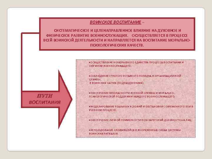 ВОИНСКОЕ ВОСПИТАНИЕ – СИСТЕМАТИЧЕСКОЕ И ЦЕЛЕНАПРАВЛЕННОЕ ВЛИЯНИЕ НА ДУХОВНОЕ И ФИЗИЧЕСКОЕ РАЗВИТИЕ ВОЕННОСЛУЖАЩИХ. ОСУЩЕСТВЛЯЕТСЯ В ПРОЦЕССЕ ВСЕЙ ВОИНСКОЙ ДЕЯТЕЛЬНОСТИ И НАПРАВЛЯЕТСЯ НА ВОСПИТАНИЕ МОРАЛЬНОПСИХОЛОГИЧЕСКИХ КАЧЕСТВ. ·ОСУЩЕСТВЛЕНИЕ НЕРАЗРЫВНОГО ЕДИНСТВА ПРОЦЕССА ВОСПИТАНИЯ И ОБУЧЕНИЯ ВОЕННОСЛУЖАЩЕГО; ·СОБЛЮДЕНИЕ СТРОГОГО УСТАВНОГО ПОРЯДКА В ОРГАНИЗАЦИИ ВСЕЙ СЛУЖБЫ, В ВОИНСКИХ ЧАСТЯХ (ПОДРАЗДЕЛЕНИЯХ); ПУТИ ВОСПИТАНИЯ ·ОБЕСПЕЧЕНИЕ БЕЗОПАСНОСТИ ВОЕННОЙ СЛУЖБЫ И МОРАЛЬНОПСИХОЛОГИЧЕСКОЙ ПОДДЕРЖКИ КАЖДОГО ВОЕННОСЛУЖАЩЕГО; ·МОДЕЛИРОВАНИЕ РЕАЛЬНЫХ УСЛОВИЙ И ОБСТАНОВКИ СОВРЕМЕННОГО БОЯ В УЧЕБНОМ ПРОЦЕССЕ; ·ОБЕСПЕЧЕНИЕ ЛИЧНОЙ ПРИМЕРНОСТИ ВСЕХ КАТЕГОРИЙ ДОЛЖНОСТНЫХ ЛИЦ; ·ИСПОЛЬЗОВАНИЕ СЛОЖИВШЕЙСЯ В ВООРУЖЕННЫХ СИЛАХ СИСТЕМЫ ВОИНСКИХ РИТУАЛОВ.