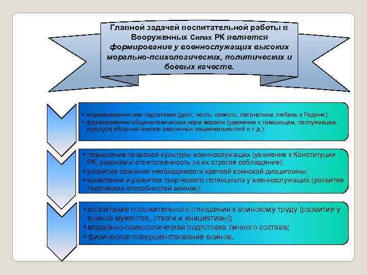 Главной задачей воспитательной работы в Вооруженных Силах РК является формирование у военнослужащих высоких морально-психологических, политических и боевых качеств. • мировоззренческая подготовка (долг, честь, совесть, патриотизм, любовь к Родине); • формирование общечеловеческих норм морали (уважение к товарищам, сослуживцам, культура общения воинов различных национальностей и т. д. ); • повышение правовой культуры военнослужащих (уважение к Конституции РК, законам и ответственность за их строгое соблюдение); • развитие сознания необходимости крепкой воинской дисциплины; • выявление и развитие творческого потенциала у военнослужащих (развитие творческих способностей воинов); • воспитание положительного отношения к воинскому труду (развитие у воинов мужества, отваги и инициативы); • морально-психологическая подготовка личного состава; • физическое совершенствование воинов.