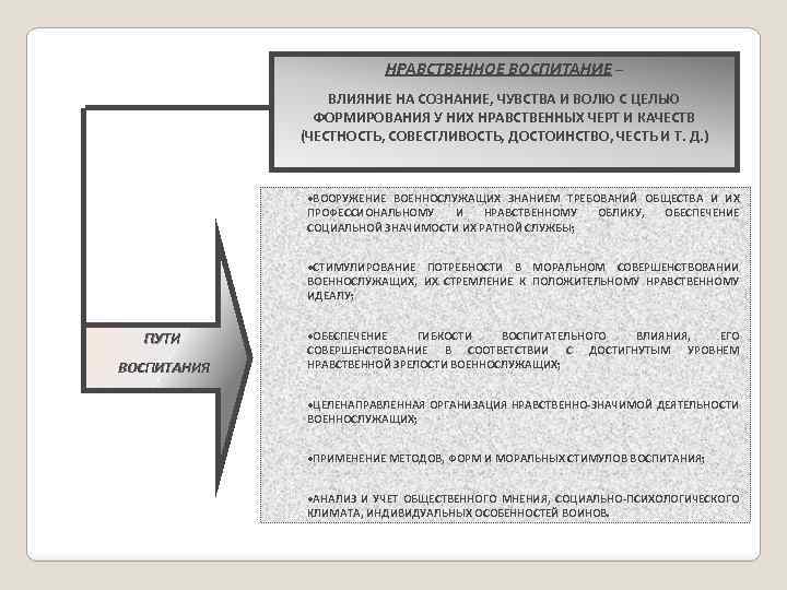 НРАВСТВЕННОЕ ВОСПИТАНИЕ – ВЛИЯНИЕ НА СОЗНАНИЕ, ЧУВСТВА И ВОЛЮ С ЦЕЛЬЮ ФОРМИРОВАНИЯ У НИХ НРАВСТВЕННЫХ ЧЕРТ И КАЧЕСТВ (ЧЕСТНОСТЬ, СОВЕСТЛИВОСТЬ, ДОСТОИНСТВО, ЧЕСТЬ И Т. Д. ) ·ВООРУЖЕНИЕ ВОЕННОСЛУЖАЩИХ ЗНАНИЕМ ТРЕБОВАНИЙ ОБЩЕСТВА И ИХ ПРОФЕССИОНАЛЬНОМУ И НРАВСТВЕННОМУ ОБЛИКУ, ОБЕСПЕЧЕНИЕ СОЦИАЛЬНОЙ ЗНАЧИМОСТИ ИХ РАТНОЙ СЛУЖБЫ; ·СТИМУЛИРОВАНИЕ ПОТРЕБНОСТИ В МОРАЛЬНОМ СОВЕРШЕНСТВОВАНИИ ВОЕННОСЛУЖАЩИХ, ИХ СТРЕМЛЕНИЕ К ПОЛОЖИТЕЛЬНОМУ НРАВСТВЕННОМУ ИДЕАЛУ; ПУТИ ВОСПИТАНИЯ ·ОБЕСПЕЧЕНИЕ ГИБКОСТИ ВОСПИТАТЕЛЬНОГО ВЛИЯНИЯ, ЕГО СОВЕРШЕНСТВОВАНИЕ В СООТВЕТСТВИИ С ДОСТИГНУТЫМ УРОВНЕМ НРАВСТВЕННОЙ ЗРЕЛОСТИ ВОЕННОСЛУЖАЩИХ; ·ЦЕЛЕНАПРАВЛЕННАЯ ОРГАНИЗАЦИЯ НРАВСТВЕННО-ЗНАЧИМОЙ ДЕЯТЕЛЬНОСТИ ВОЕННОСЛУЖАЩИХ; ·ПРИМЕНЕНИЕ МЕТОДОВ, ФОРМ И МОРАЛЬНЫХ СТИМУЛОВ ВОСПИТАНИЯ; ·АНАЛИЗ И УЧЕТ ОБЩЕСТВЕННОГО МНЕНИЯ, СОЦИАЛЬНО-ПСИХОЛОГИЧЕСКОГО КЛИМАТА, ИНДИВИДУАЛЬНЫХ ОСОБЕННОСТЕЙ ВОИНОВ.