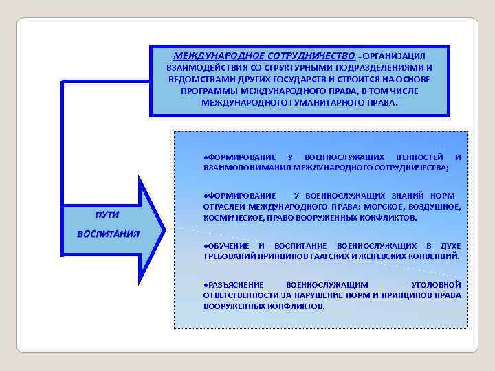 МЕЖДУНАРОДНОЕ СОТРУДНИЧЕСТВО – ОРГАНИЗАЦИЯ ВЗАИМОДЕЙСТВИЯ СО СТРУКТУРНЫМИ ПОДРАЗДЕЛЕНИЯМИ И ВЕДОМСТВАМИ ДРУГИХ ГОСУДАРСТВ И СТРОИТСЯ НА ОСНОВЕ ПРОГРАММЫ МЕЖДУНАРОДНОГО ПРАВА, В ТОМ ЧИСЛЕ МЕЖДУНАРОДНОГО ГУМАНИТАРНОГО ПРАВА. ·ФОРМИРОВАНИЕ У ВОЕННОСЛУЖАЩИХ ЦЕННОСТЕЙ И ВЗАИМОПОНИМАНИЯ МЕЖДУНАРОДНОГО СОТРУДНИЧЕСТВА; ПУТИ ВОСПИТАНИЯ ·ФОРМИРОВАНИЕ У ВОЕННОСЛУЖАЩИХ ЗНАНИЙ НОРМ ОТРАСЛЕЙ МЕЖДУНАРОДНОГО ПРАВА: МОРСКОЕ, ВОЗДУШНОЕ, КОСМИЧЕСКОЕ, ПРАВО ВООРУЖЕННЫХ КОНФЛИКТОВ. ·ОБУЧЕНИЕ И ВОСПИТАНИЕ ВОЕННОСЛУЖАЩИХ В ДУХЕ ТРЕБОВАНИЙ ПРИНЦИПОВ ГААГСКИХ И ЖЕНЕВСКИХ КОНВЕНЦИЙ. ·РАЗЪЯСНЕНИЕ ВОЕННОСЛУЖАЩИМ УГОЛОВНОЙ ОТВЕТСТВЕННОСТИ ЗА НАРУШЕНИЕ НОРМ И ПРИНЦИПОВ ПРАВА ВООРУЖЕННЫХ КОНФЛИКТОВ.