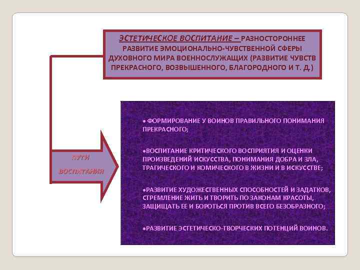 ЭСТЕТИЧЕСКОЕ ВОСПИТАНИЕ – РАЗНОСТОРОННЕЕ РАЗВИТИЕ ЭМОЦИОНАЛЬНО-ЧУВСТВЕННОЙ СФЕРЫ ДУХОВНОГО МИРА ВОЕННОСЛУЖАЩИХ (РАЗВИТИЕ ЧУВСТВ ПРЕКРАСНОГО, ВОЗВЫШЕННОГО, БЛАГОРОДНОГО И Т. Д. ) · ФОРМИРОВАНИЕ У ВОИНОВ ПРАВИЛЬНОГО ПОНИМАНИЯ ПРЕКРАСНОГО; ПУТИ ВОСПИТАНИЯ ·ВОСПИТАНИЕ КРИТИЧЕСКОГО ВОСПРИЯТИЯ И ОЦЕНКИ ПРОИЗВЕДЕНИЙ ИСКУССТВА, ПОНИМАНИЯ ДОБРА И ЗЛА, ТРАГИЧЕСКОГО И КОМИЧЕСКОГО В ЖИЗНИ И В ИСКУССТВЕ; ·РАЗВИТИЕ ХУДОЖЕСТВЕННЫХ СПОСОБНОСТЕЙ И ЗАДАТКОВ, СТРЕМЛЕНИЕ ЖИТЬ И ТВОРИТЬ ПО ЗАКОНАМ КРАСОТЫ, ЗАЩИЩАТЬ ЕЕ И БОРОТЬСЯ ПРОТИВ ВСЕГО БЕЗОБРАЗНОГО; ·РАЗВИТИЕ ЭСТЕТИЧЕСКО-ТВОРЧЕСКИХ ПОТЕНЦИЙ ВОИНОВ.