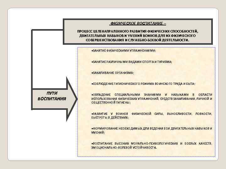 ФИЗИЧЕСКОЕ ВОСПИТАНИЕ – ПРОЦЕСС ЦЕЛЕНАПРАЛЕННОГО РАЗВИТИЯ ФИЗИЧЕСКИХ СПОСОБНОСТЕЙ, ДВИГАТЕЛЬНЫХ НАВЫКОВ И УМЕНИЙ ВОИНОВ ДЛЯ ИХ ФИЗИЧЕСКОГО СОВЕРШЕНСТВОВАНИЯ И СЛУЖЕБНО-БОЕВОЙ ДЕЯТЕЛЬНОСТИ. ·ЗАНЯТИЕ ФИЗИЧЕСКИМИ УПРАЖНЕНИЯМИ; ·ЗАНЯТИЕ РАЗЛИЧНЫМИ ВИДАМИ СПОРТА И ТУРИЗМА; ·ЗАКАЛИВАНИЕ ОРГАНИЗМА; ·СОБЛЮДЕНИЕ ГИГИЕНИЧЕСКОГО РЕЖИМА ВОИНСКОГО ТРУДА И БЫТА; ПУТИ ВОСПИТАНИЯ ·ОВЛАДЕНИЕ СПЕЦИАЛЬНЫМИ ЗНАНИЯМИ И НАВЫКАМИ В ОБЛАСТИ ИСПОЛЬЗОВАНИЯ ФИЗИЧЕСКИХ УПРАЖНЕНИЙ, СРЕДСТВ ЗАКАЛИВАНИЯ, ЛИЧНОЙ И ОБЩЕСТВЕННОЙ ГИГИЕНЫ; ·РАЗВИТИЕ У ВОИНОВ ФИЗИЧЕСКОЙ СИЛЫ, ВЫНОСЛИВОСТИ, ЛОВКОСТИ, БЫСТРОТЫ В ДЕЙСТВИЯХ; ·ФОРМИРОВАНИЕ НЕОБХОДИМЫХ ДЛЯ ВЕДЕНИЯ БОЯ ДВИГАТЕЛЬНЫХ НАВЫКОВ И УМЕНИЙ; ·ВОСПИТАНИЕ ВЫСОКИХ МОРАЛЬНО-ПСИХОЛОГИЧЕСКИХ И БОЕВЫХ КАЧЕСТВ, ЭМОЦИОНАЛЬНО-ВОЛЕВОЙ УСТОЙЧИВОСТИ.