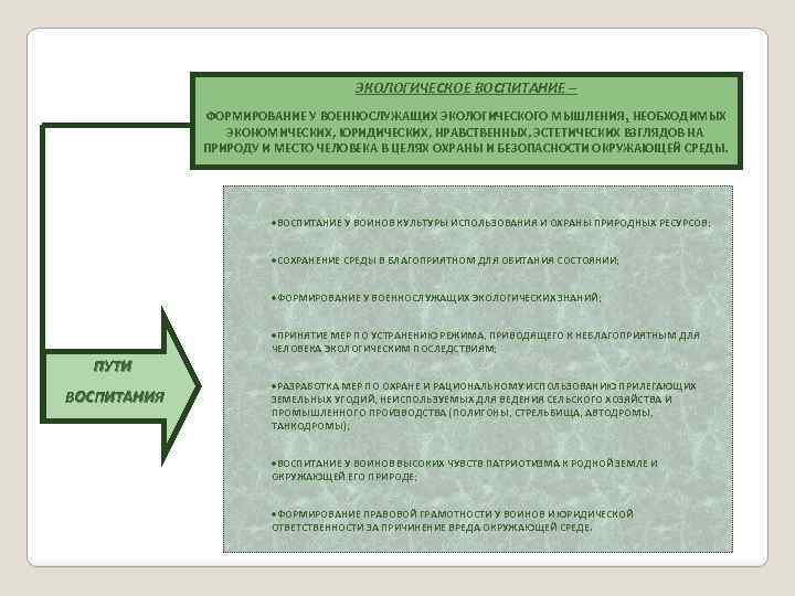 ЭКОЛОГИЧЕСКОЕ ВОСПИТАНИЕ – ФОРМИРОВАНИЕ У ВОЕННОСЛУЖАЩИХ ЭКОЛОГИЧЕСКОГО МЫШЛЕНИЯ, НЕОБХОДИМЫХ ЭКОНОМИЧЕСКИХ, ЮРИДИЧЕСКИХ, НРАВСТВЕННЫХ, ЭСТЕТИЧЕСКИХ ВЗГЛЯДОВ НА ПРИРОДУ И МЕСТО ЧЕЛОВЕКА В ЦЕЛЯХ ОХРАНЫ И БЕЗОПАСНОСТИ ОКРУЖАЮЩЕЙ СРЕДЫ. ·ВОСПИТАНИЕ У ВОИНОВ КУЛЬТУРЫ ИСПОЛЬЗОВАНИЯ И ОХРАНЫ ПРИРОДНЫХ РЕСУРСОВ; ·СОХРАНЕНИЕ СРЕДЫ В БЛАГОПРИЯТНОМ ДЛЯ ОБИТАНИЯ СОСТОЯНИИ; ·ФОРМИРОВАНИЕ У ВОЕННОСЛУЖАЩИХ ЭКОЛОГИЧЕСКИХ ЗНАНИЙ; ·ПРИНЯТИЕ МЕР ПО УСТРАНЕНИЮ РЕЖИМА, ПРИВОДЯЩЕГО К НЕБЛАГОПРИЯТНЫМ ДЛЯ ЧЕЛОВЕКА ЭКОЛОГИЧЕСКИМ ПОСЛЕДСТВИЯМ; ПУТИ ВОСПИТАНИЯ ·РАЗРАБОТКА МЕР ПО ОХРАНЕ И РАЦИОНАЛЬНОМУ ИСПОЛЬЗОВАНИЮ ПРИЛЕГАЮЩИХ ЗЕМЕЛЬНЫХ УГОДИЙ, НЕИСПОЛЬЗУЕМЫХ ДЛЯ ВЕДЕНИЯ СЕЛЬСКОГО ХОЗЯЙСТВА И ПРОМЫШЛЕННОГО ПРОИЗВОДСТВА (ПОЛИГОНЫ, СТРЕЛЬБИЩА, АВТОДРОМЫ, ТАНКОДРОМЫ); ·ВОСПИТАНИЕ У ВОИНОВ ВЫСОКИХ ЧУВСТВ ПАТРИОТИЗМА К РОДНОЙ ЗЕМЛЕ И ОКРУЖАЮЩЕЙ ЕГО ПРИРОДЕ; ·ФОРМИРОВАНИЕ ПРАВОВОЙ ГРАМОТНОСТИ У ВОИНОВ И ЮРИДИЧЕСКОЙ ОТВЕТСТВЕННОСТИ ЗА ПРИЧИНЕНИЕ ВРЕДА ОКРУЖАЮЩЕЙ СРЕДЕ.