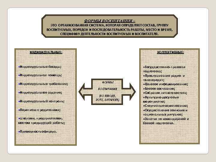 ФОРМЫ ВОСПИТАНИЯ – ЭТО ОРГАНИЗОВАННАЯ СИСТЕМА, КОТОРАЯ ОПРЕДЕЛЯЕТ СОСТАВ, ГРУППУ ВОСПИТУЕМЫХ, ПОРЯДОК И ПОСЛЕДОВАТЕЛЬНОСТЬ РАБОТЫ, МЕСТО И ВРЕМЯ, СПЕЦИФИКУ ДЕЯТЕЛЬНОСТИ ВОСПИТУЕМЫХ И ВОСПИТАТЕЛЯ. ИНДИВИДУАЛЬНЫЕ: КОЛЛЕКТИВНЫЕ: ·Индивидуальные беседы; ·Индивидуальная помощь; ·Индивидуальные требования; ·Индивидуальное задание; ·Индивидуальный контроль; ·Переписка с родителями; ·школами, предприятиями, местом предыдущей работы; ·Примерность офицера. ФОРМЫ ВОСПИТАНИЯ (ВО ВЗВОДЕ, РОТЕ, БАТАРЕЯХ) ·Государственно-правовая подготовка; ·Прослушивание радио- и телепередач; ·Целевое информирование; ·Боевое состязание; ·Собрание личного состава; ·Культурно-досуговые мероприятия; ·Спортивные соревнования; ·Осуществление воинских и национальных ритуалов; ·Занятия по командирской и боевой подготовке.