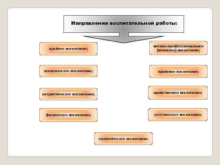 Направления воспитательной работы: идейное воспитание; военно-профессиональное (воинское) воспитание; политическое воспитание; правовое воспитание; патриотическое воспитание; нравственное воспитание; физическое воспитание; эстетическое воспитание; экологическое воспитание.