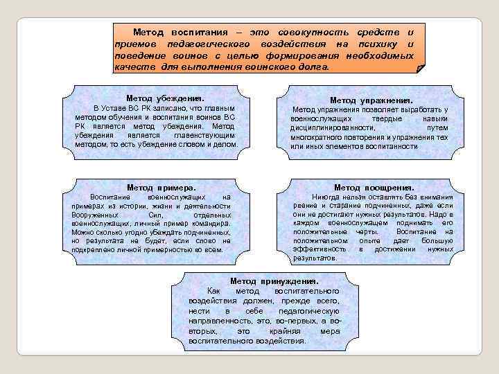 Метод воспитания – это совокупность средств и приемов педагогического воздействия на психику и поведение воинов с целью формирования необходимых качеств для выполнения воинского долга. Метод убеждения. В Уставе ВС РК записано, что главным методом обучения и воспитания воинов ВС РК является метод убеждения. Метод убеждения является главенствующим методом, то есть убеждение словом и делом. Метод примера. Воспитание военнослужащих на примерах из истории, жизни и деятельности Вооруженных Сил, отдельных военнослужащих, личный пример командира. Можно сколько угодно убеждать подчиненных, но результата не будет, если слово не подкреплено личной примерностью во всем. Метод упражнения позволяет выработать у военнослужащих твердые навыки дисциплинированности, путем многократного повторения и упражнения тех или иных элементов воспитанности Метод поощрения. Никогда нельзя оставлять без внимания рвение и старание подчиненных, даже если они не достигают нужных результатов. Надо в каждом военнослужащем поднимать его положительные черты. Воспитание на положительном опыте дает большую эффективность в достижении нужных результатов. Метод принуждения. Как метод воспитательного воздействия должен, прежде всего, нести в себе педагогическую направленность, это, во-первых, а вовторых, это крайняя мера воспитательного воздействия.
