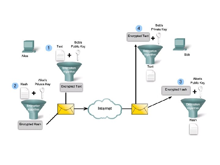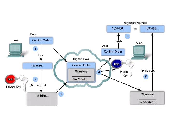 • Pasii procesului semnaturii digitale (continuare): 5. Dispozitivul receptor decripteaza semnatura folosind cheia publica a dispozitivului transmitator. Acest pas dezvaluie presupusa valoare hash a dispozitivului transmitator 6. Dispozitivul receptor face un hash al documentului receptionat, fara semnatura sa, si compara acest hash cu hash-ul semnatura decriptat. Daca hash-urile sunt identice, documentul este autentic