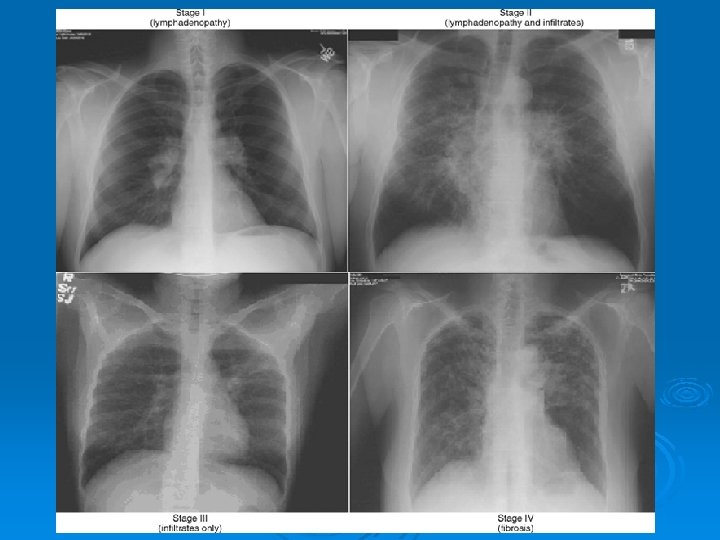 Stage III. PA chest radiograph depicts diffuse bilateral reticulonodular opacities without lymphadenopathy.