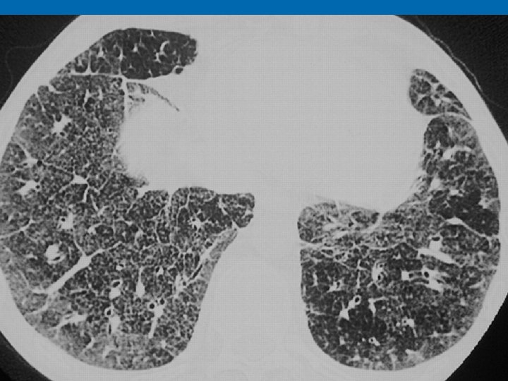 YAKINMALAR Ø Ateş, yorgunluk, kilo kaybı, zaman gece terlemesi gibi nonspesifik bulgular Ø %90 dan fazla olguda akciğer tutulumu, dispne, kuru öksürük, göğüste sıkışma hissi, fibrokistik tutulum olan akciğerde kronik balgam çıkartma ve hemoptizi