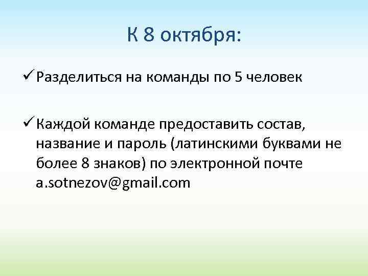 К 8 октября: ü Разделиться на команды по 5 человек ü Каждой команде предоставить состав, название и пароль (латинскими буквами не более 8 знаков) по электронной почте a. sotnezov@gmail. com