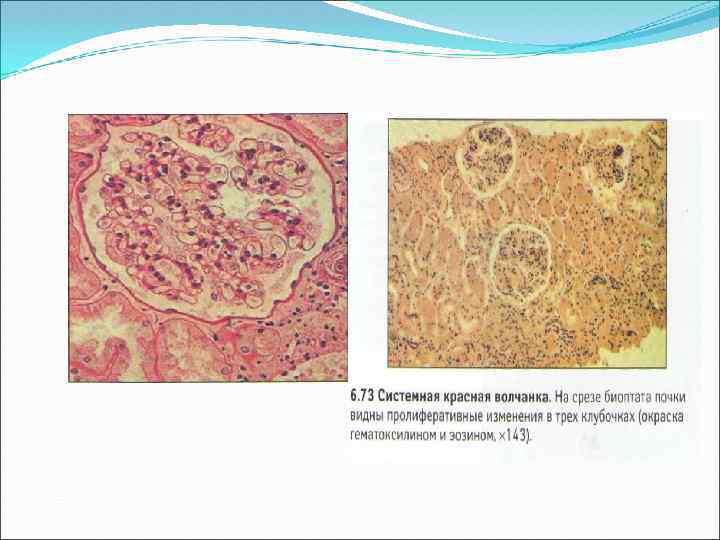 поражение почек: Класс нефрита Морфологические особенности Клинические проявления Класс I : минимальные Норм. клубочки при световой микроскопии и наличие депозитов в мезангии при иммуноглюоресценции Отсутствуют изменения в моче, функция почек нормальная. Прогноз благоприятный Различная степень мезангиальной гиперклеточности с наличием иммунных депозитов в мезангии Протеинурия <1 гсут, гематурия, . Ф-я почек сохранена. Прогноз благопр. при отсутствии трансформации в более тяжелый морф. тип нефрита изменения Класс II : мезангиальный пролиферативный гломерулонефрит Класс III : фокальный гломерулонефрит ( очагов. пролиферативный) Класс IV диффузный пролиферативный Класс V : мембранозный гломерулонефрит Класс V I : нефросклероз Пролиферация периферич. капил. Протеинурия 1 -2 гсут. М. б. петель сегментарным нефротический синдром. распределением, вовлечением высокий риск развития ХПН менее 50% клубочков Морфология та же, что при классе III, но в процесс вовлечено более 50% клубочков Равномерное утолщение базальной мембраны Выраженная протеинурия, гематурия. Высокая частота АГ и ХПН Протеинурия более 3 гл, нефр. синдром. Клинические и лабораторные признаки ХПН. Прогноз неблагоприятный.