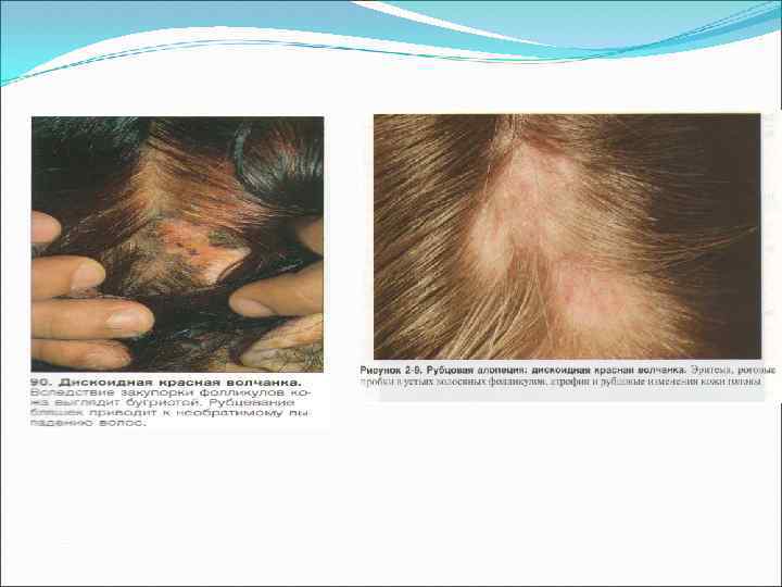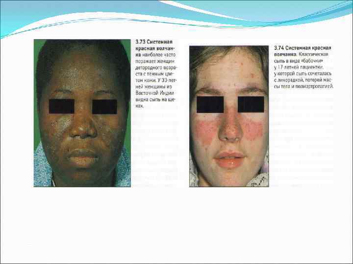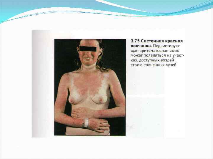 Клиническая картина Поражения кожи : Фотосенсибилизация (центробежная эритема Биетта) сосудистая (васкулитная) бабочка, синдром Роуэлла (многочисленные эритематозные, резко отечные кольцевидные высыпания, напоминающие многоформную эксудативную эритему) дискоидная волчанка ( характерные черты -эритема, инфильтрация, гиперкератоз, атрофия) диссеминированная красная волчанка (множественные, рассеянные по различным участкам кожного покрова очаги дискоидной волчанки) капилляриты ( отечная эритема с мелкоточечными геморрагиями на подушечках пальцев рук, ладонях, подошвах) алопеция