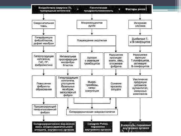 Этиология Этиология заболевания неизвестна. Считается, что ССД развивается под влиянием некоторых экзогенных факторов у людей с определенными генетическими нарушениями. К экзогенным факторам, способным индуцировать развитие ССД, относятся: Ø ретровирусы (в первую очередь цитомегаловирусы), Ø кварцевая и каменноугольная пыль, Ø органические растворители, Ø винилхлорид, Ø некоторые лекарственные средства (блеомицин и ряд других препаратов, применяемых для химиотерапии).