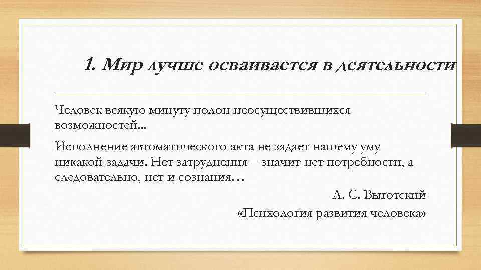 1. Мир лучше осваивается в деятельности Человек всякую минуту полон неосуществившихся возможностей. . . Исполнение автоматического акта не задает нашему уму никакой задачи. Нет затруднения – значит нет потребности, а следовательно, нет и сознания… Л. С. Выготский «Психология развития человека»